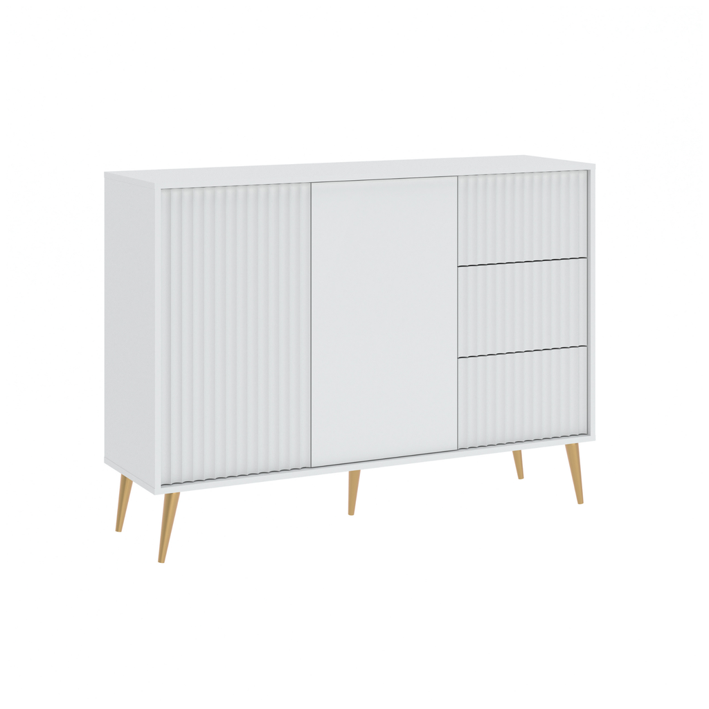 Stilinga komoda su dvejomis durelių sekcijomis ir trimis stalčiais. Vertikalių linijų raštas ir minimalistinės metalinės kojos suteikia modernumo bei elegancijos. Talpi vidaus erdvė idealiai tinka įvairių daiktų laikymui svetainėje ar kitose erdvėse.