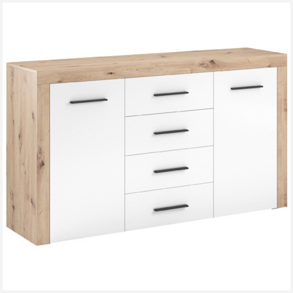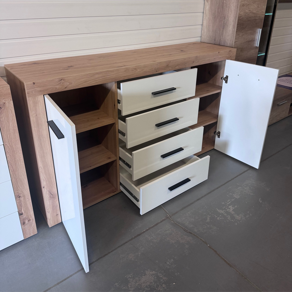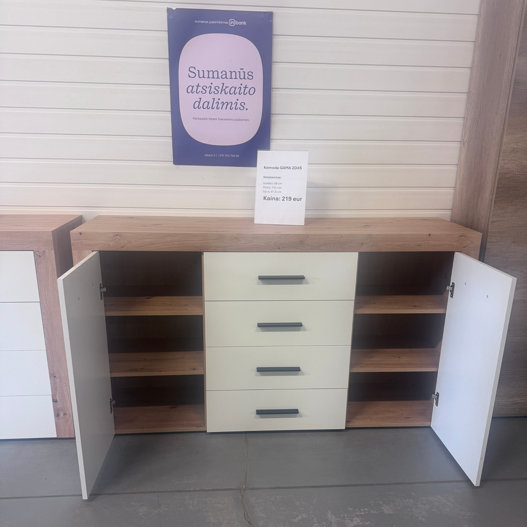 Talpi komoda GAMA su stalčiais ir durelėmis puikiai tinka svetainei, miegamajam ar kitai gyvenamosios erdvės zonai. Modernus dizainas su natūralaus medžio rašto korpusu ir balta priekine dalimi lengvai įsilies į įvairų interjerą. Daug vietos susidėti daiktams – tiek uždarose lentynose, tiek stalčiuose.