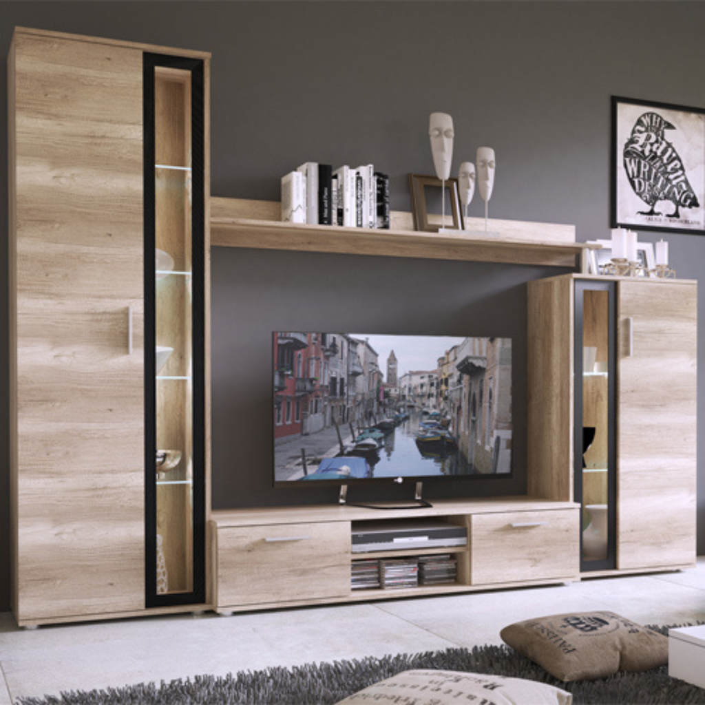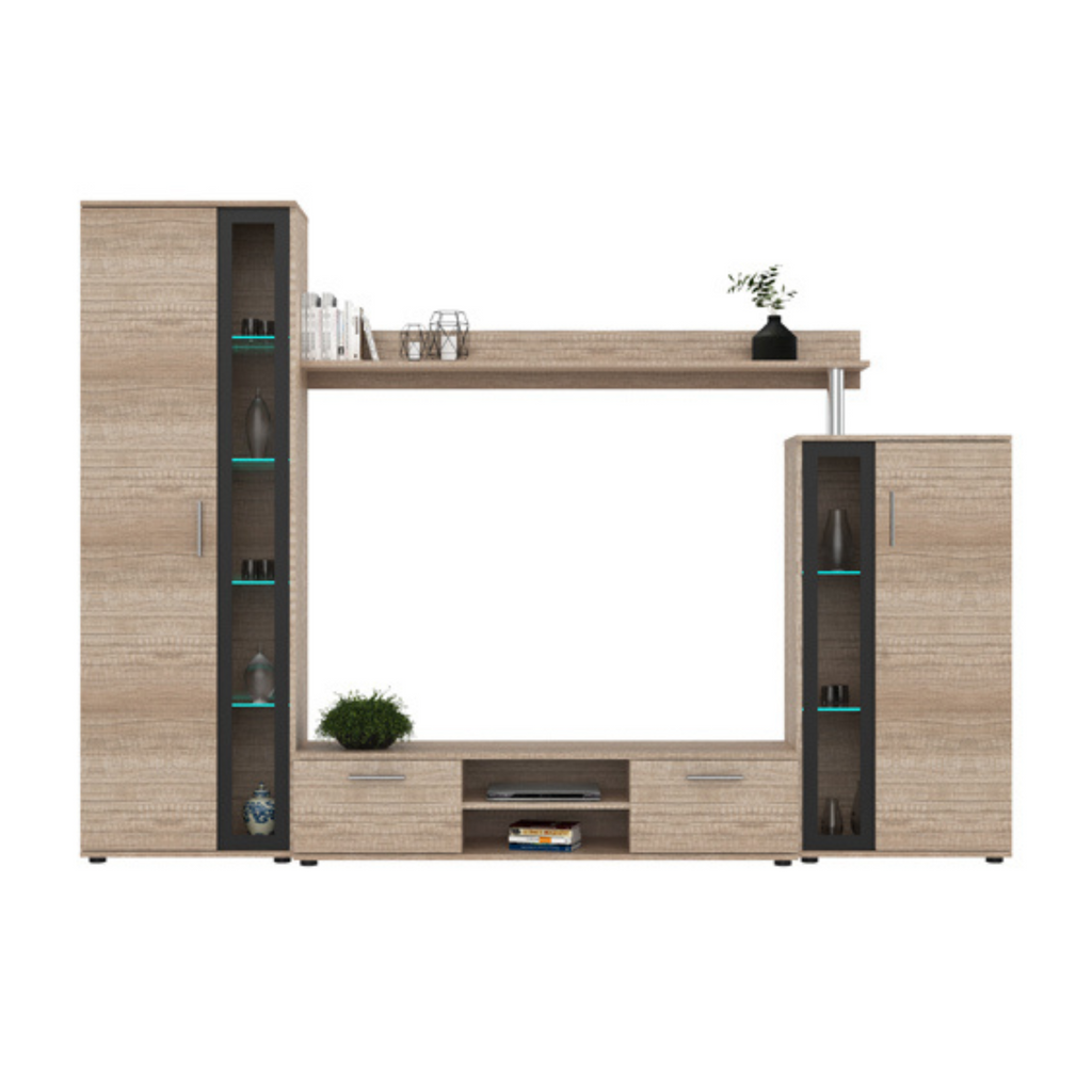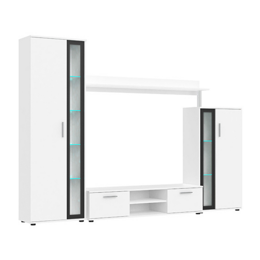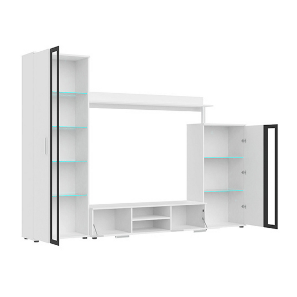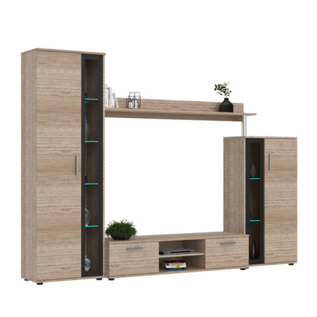 Modernus svetainės baldų komplektas iš „Bentley“ kolekcijos su integruotu LED apšvietimu suteiks jūsų kambariui jaukumo ir išskirtinumo. Stiklinės lentynėlės su švelniu apšvietimu ne tik paryškina baldų dizainą, bet ir sukuria papildomą atmosferinę šviesą vakaro metu. Funkcionalus išplanavimas leis patogiai laikyti daiktus, o atviros lentynos ir TV staliukas puikiai tiks televizoriui ir priedams.