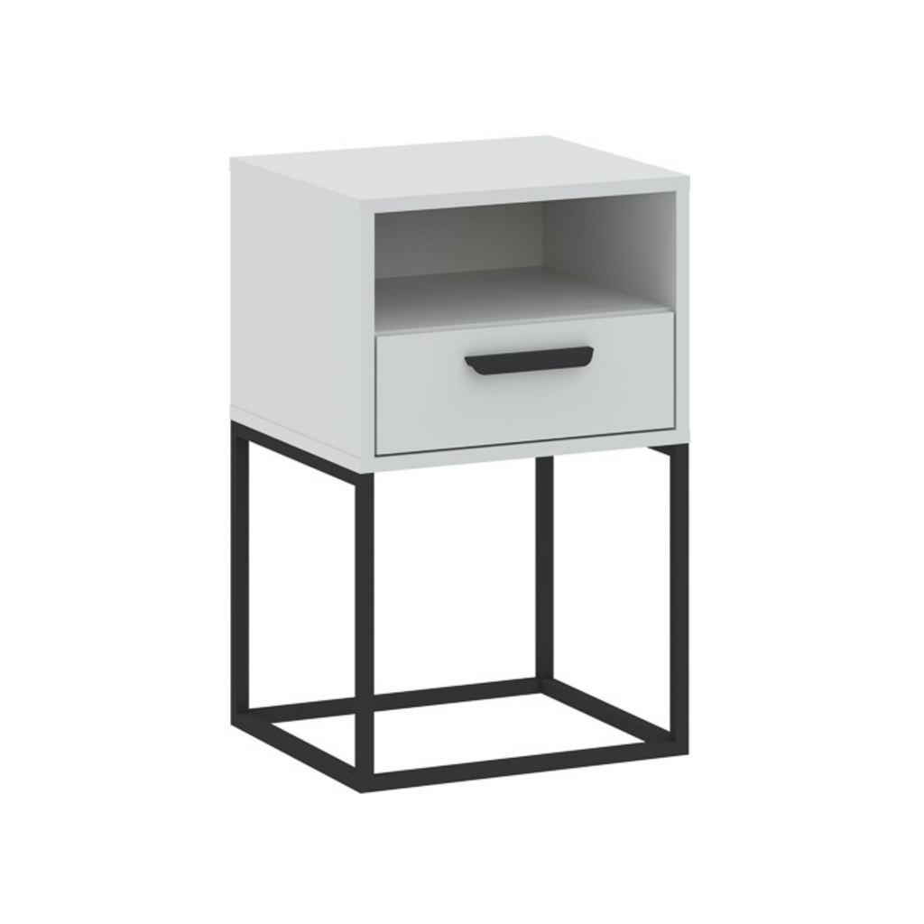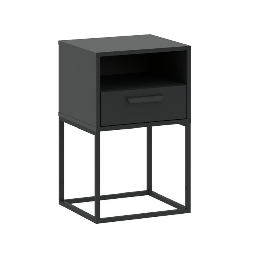 Moderni naktinė spintelė su papildoma atvira lentyna iš CADRO kolekcijos. Tvirto juodo metalo rėmas ir matinės apdailos korpusas puikiai dera minimalistiniame ar industriniame interjere. Atvira lentyna patogi knygoms ar smulkmenoms, o stalčius būtiniausiems daiktams susidėti.