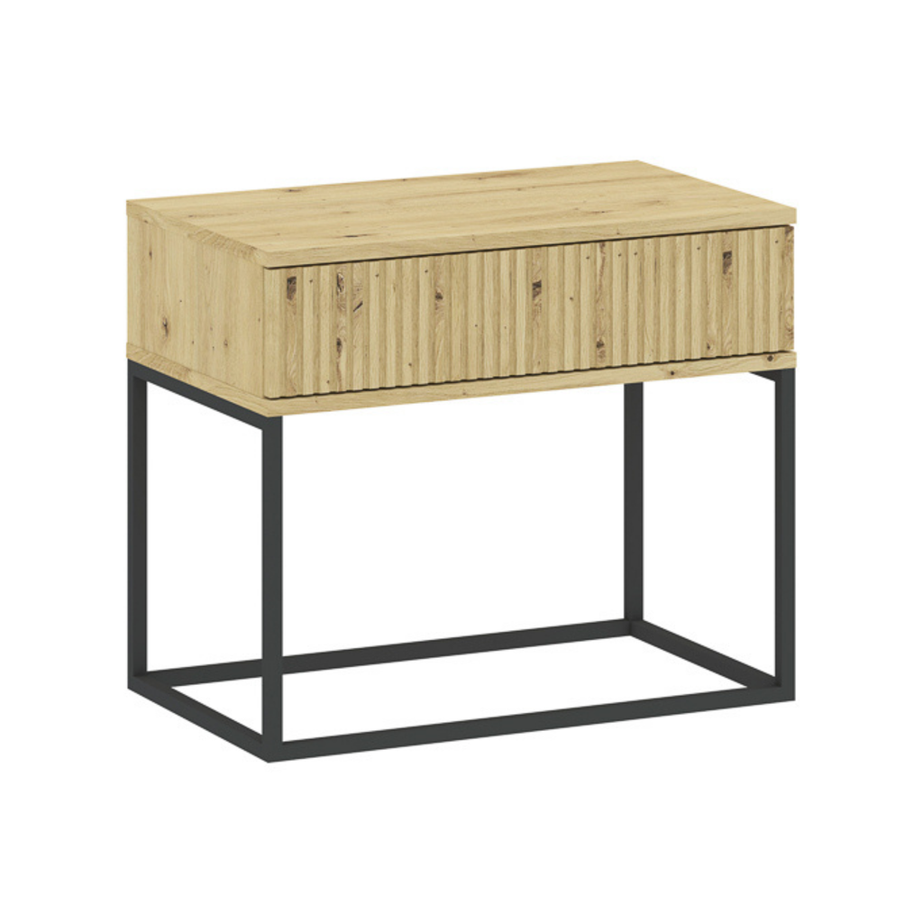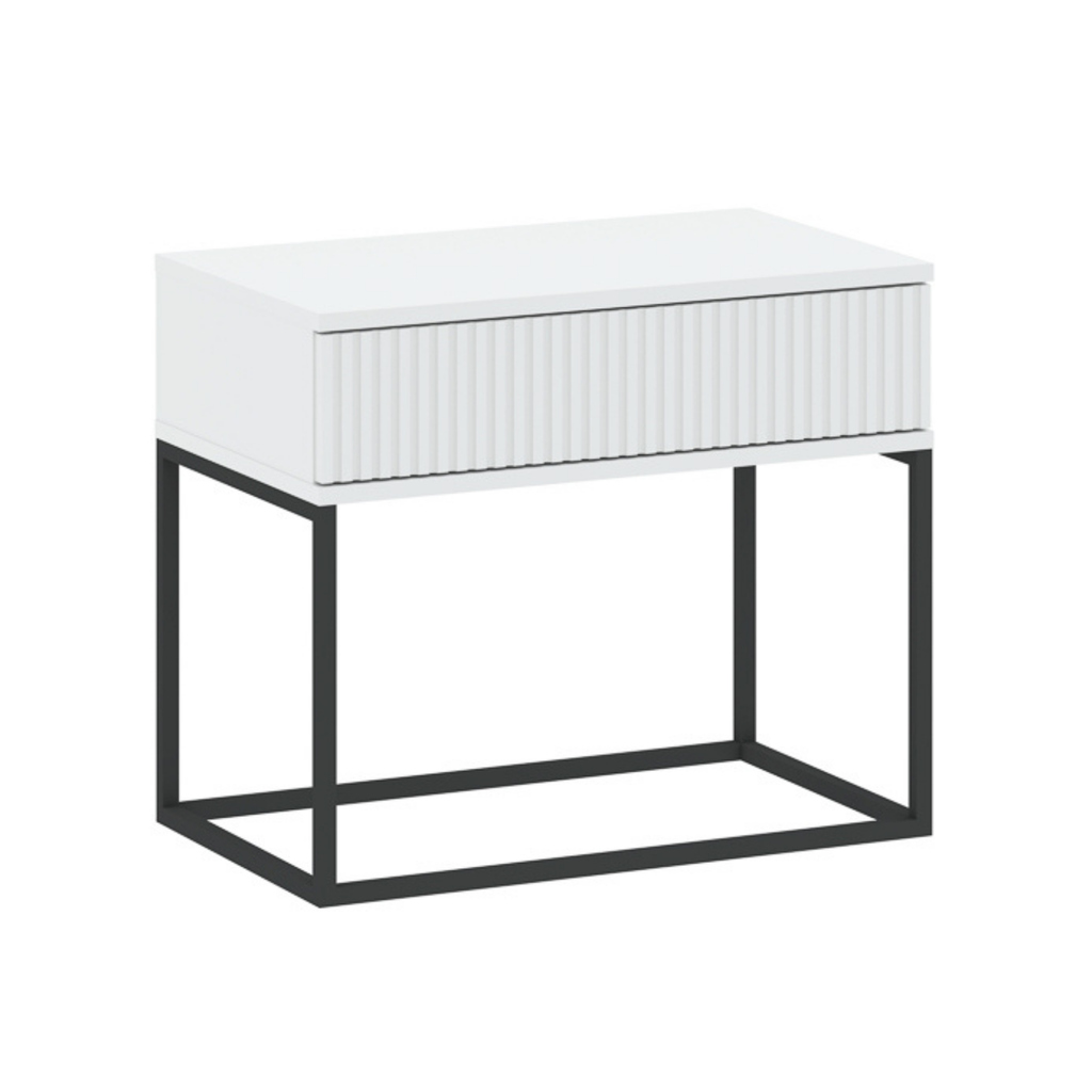 Moderni naktinė spintelė su papildoma atvira lentyna iš CADRO kolekcijos. Tvirto juodo metalo rėmas ir matinės apdailos korpusas puikiai dera minimalistiniame ar industriniame interjere. Atvira lentyna patogi knygoms ar smulkmenoms, o stalčius būtiniausiems daiktams susidėti.
