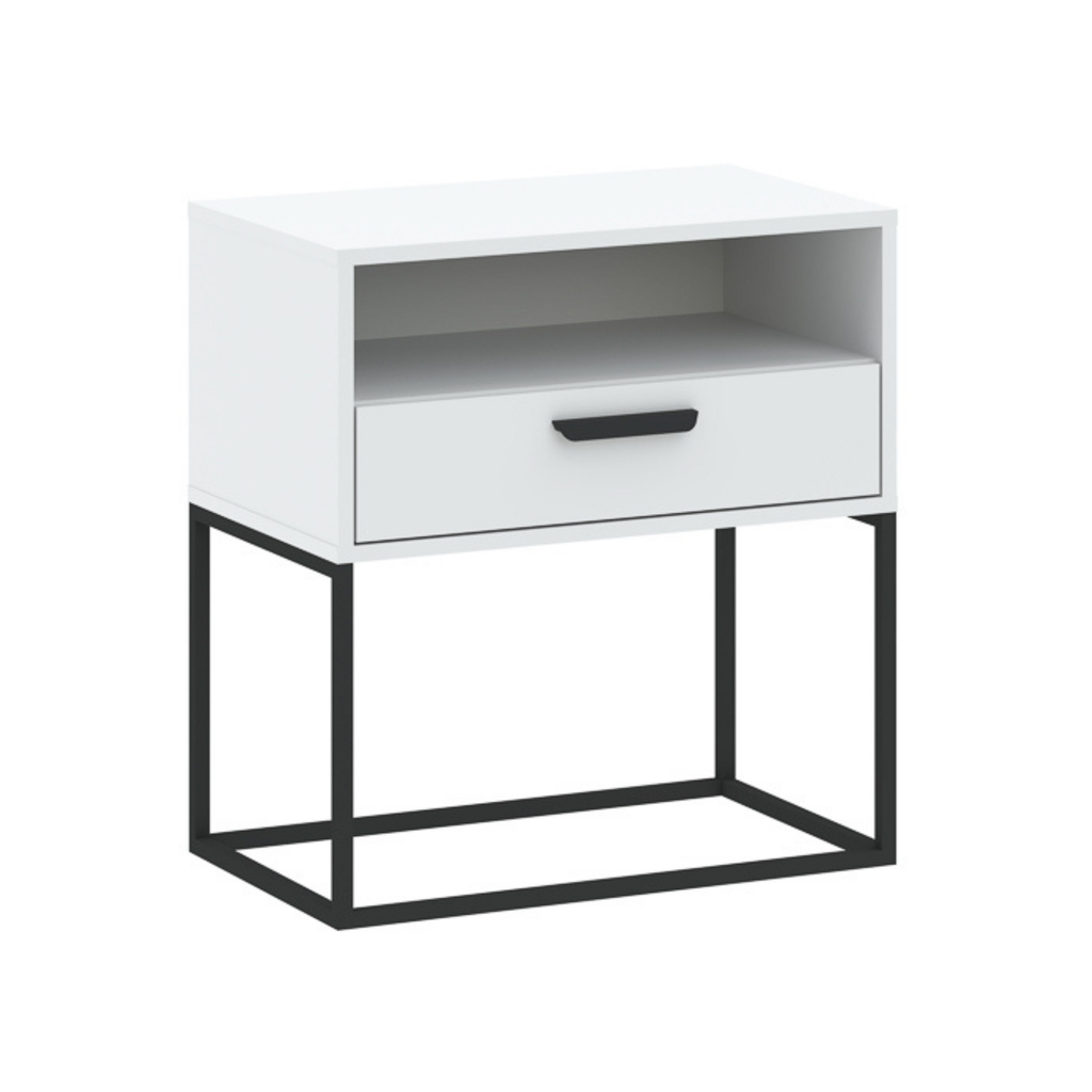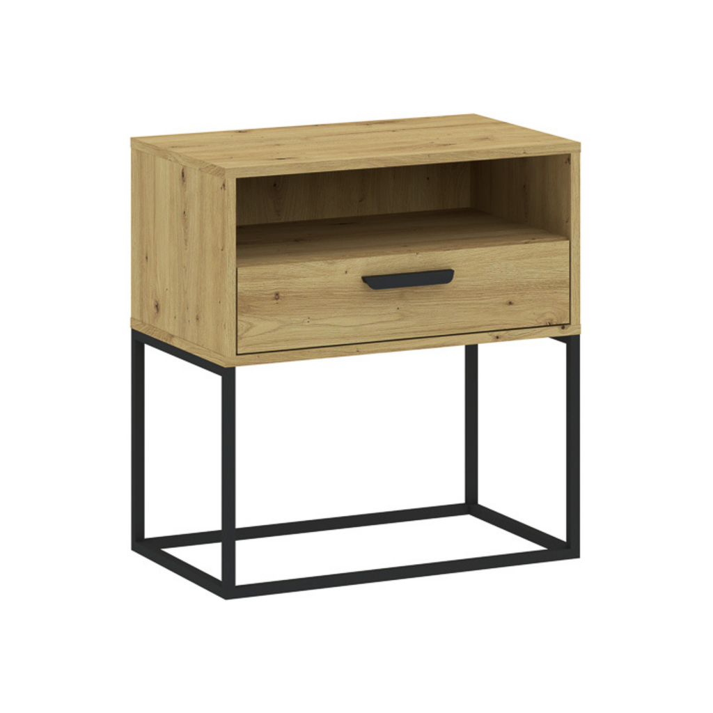Modernus naktinis staliukas su papildoma atvira lentyna iš CADRO kolekcijos. Tvirtas juodo metalo rėmas ir natūralaus medžio imitacijos korpusas puikiai dera minimalistiniame ar industriniame interjere. Atvira lentyna patogi knygoms ar smulkmenoms, o stalčius – būtiniausiems daiktams susidėti.