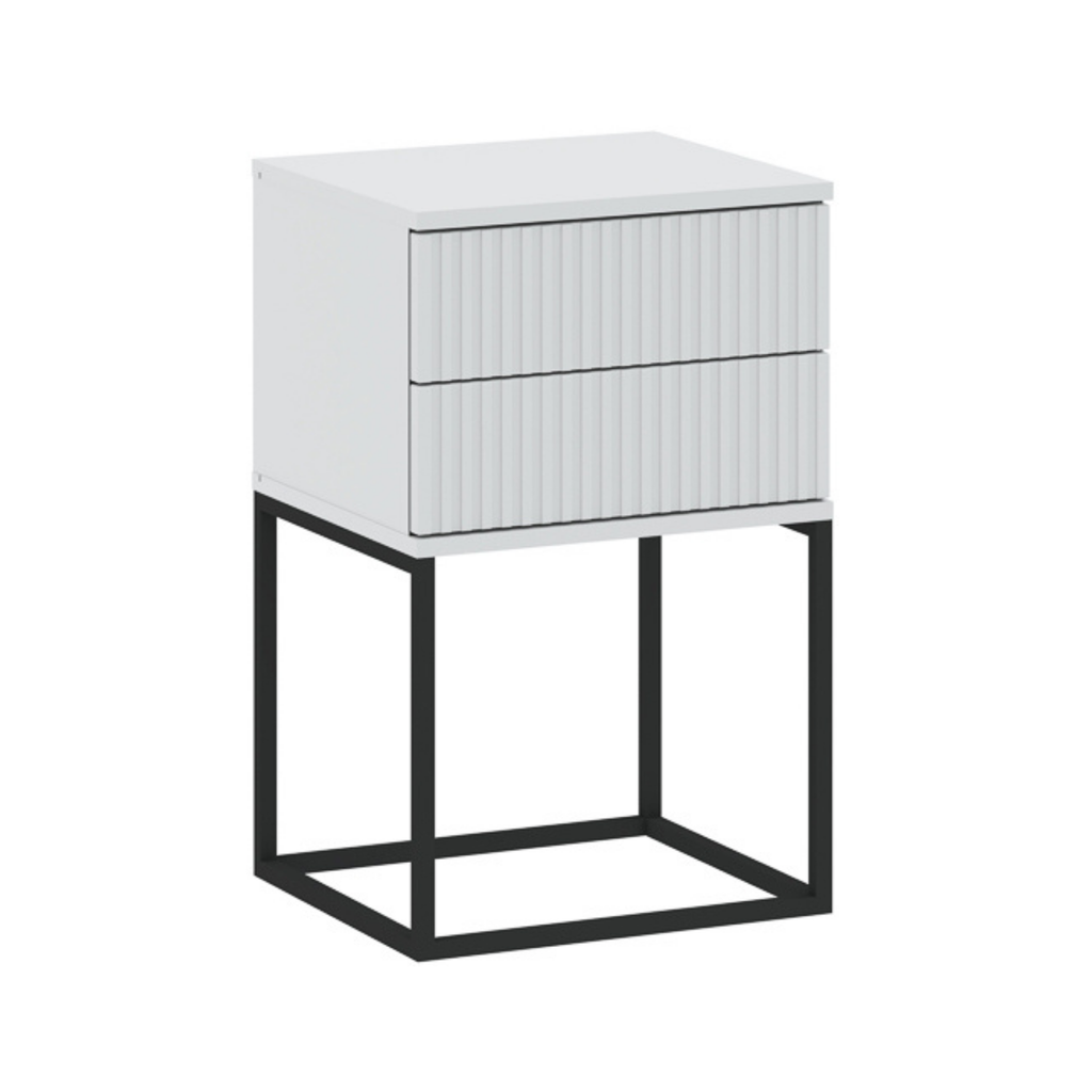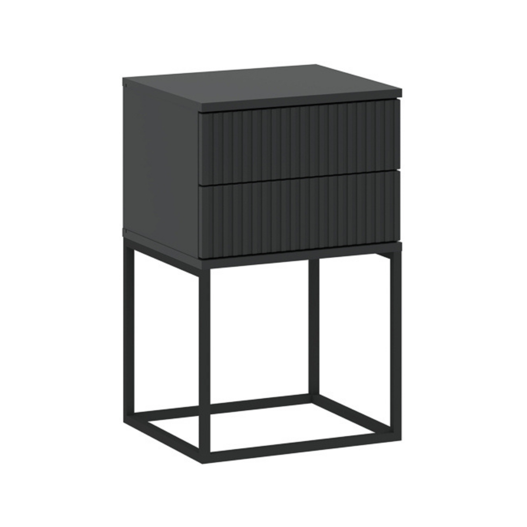 Modernus naktinis staliukas su dviem talpiais stalčiais iš CADRO kolekcijos. Tvirtas juodo metalo rėmas ir originalaus dizaino fasadas suteikia baldui išskirtinumo. Šis modelis puikiai dera tiek minimalistiniame, tiek industriniame interjere. Du patogūs stalčiai leidžia susidėti būtiniausius daiktus, todėl baldas puikiai tinka miegamajame ar kitose erdvėse.