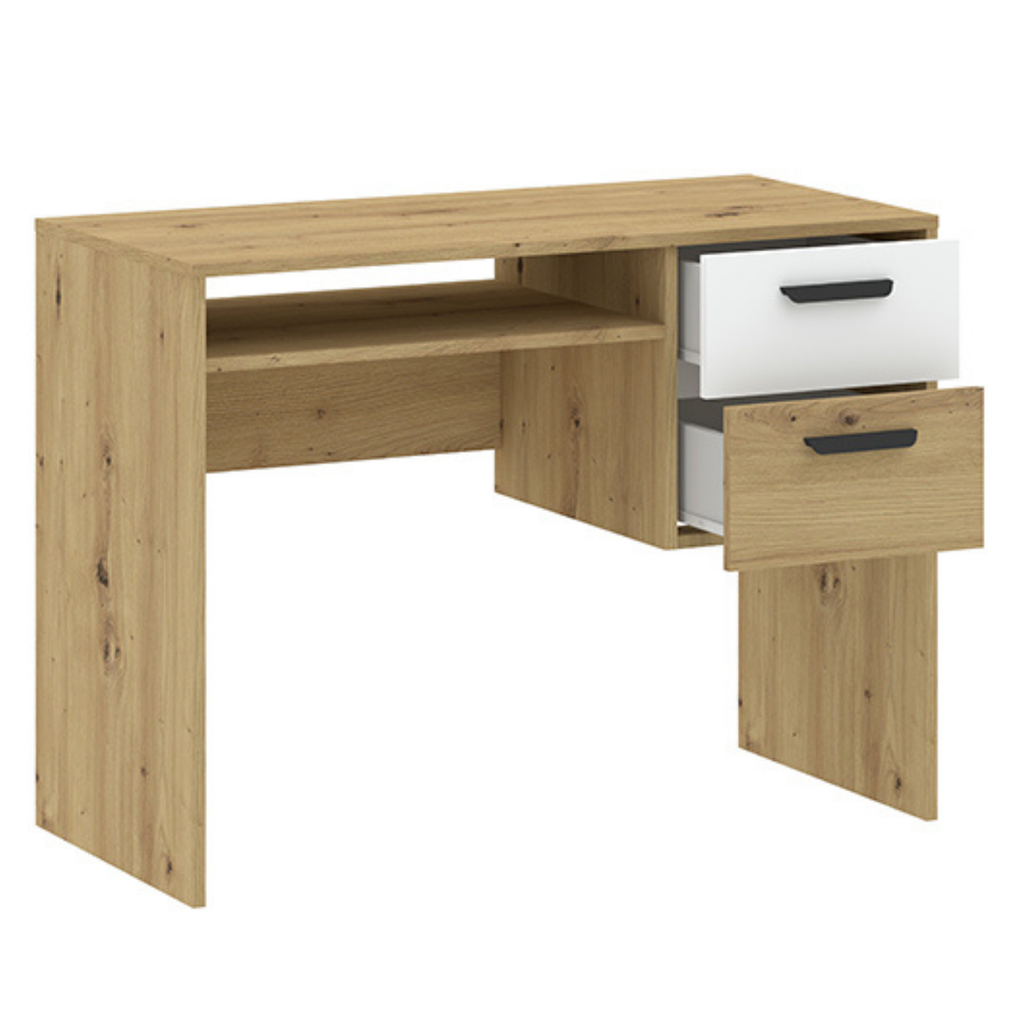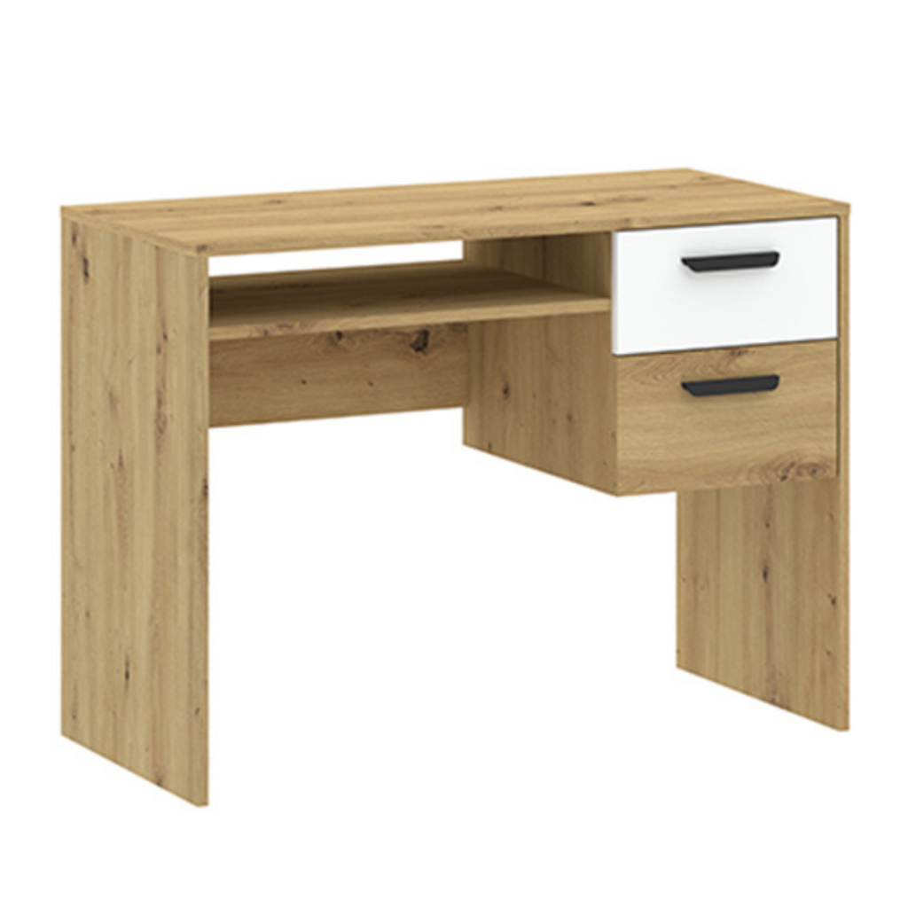 Stilingas ir funkcionalus stalas, tinkantis darbui ar mokymuisi namuose. Natūralaus ąžuolo atspalvio korpusas su baltu stalčiaus fasadu suteikia modernumo, o kompaktiškas dydis leidžia patogiai pritaikyti net mažesnėje erdvėje. Stalas turi du stalčius ir atvirą lentynėlę, todėl čia patogiai laikysite dokumentus, kanceliariją ar kitus reikalingus daiktus.
