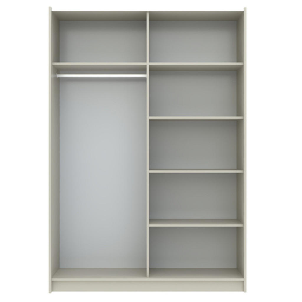 Vidinė spintos struktūra sukurta patogiam daiktų išdėstymui – vienoje pusėje yra skersinis pakaboms ir viršutinė lentyna, o kitoje – penkios erdvios lentynos sudėti drabužiams, avalynei ar dėžėms.