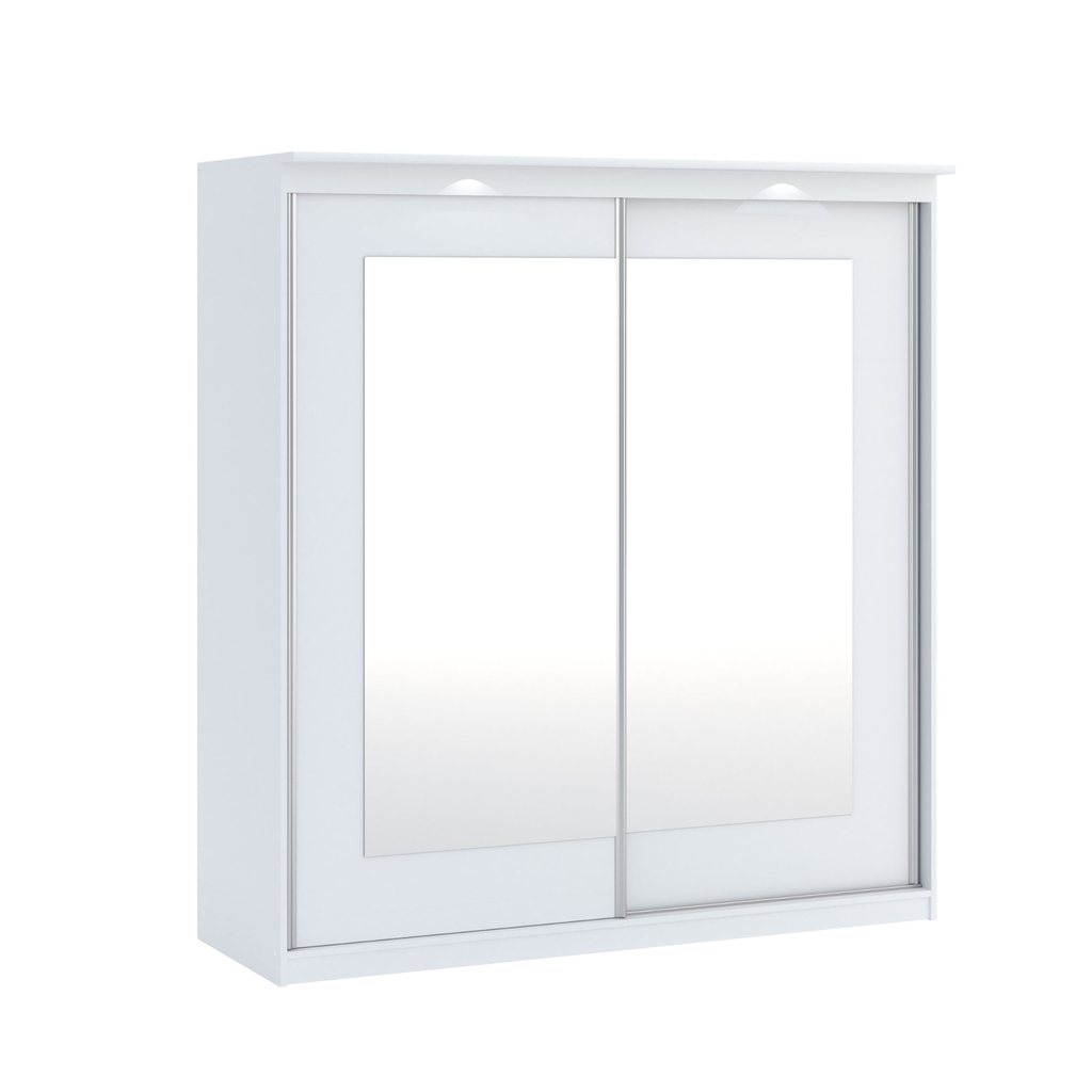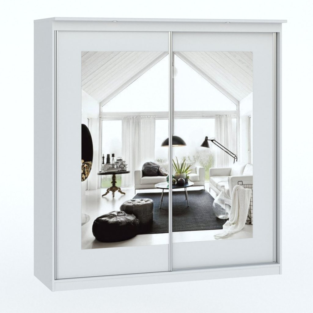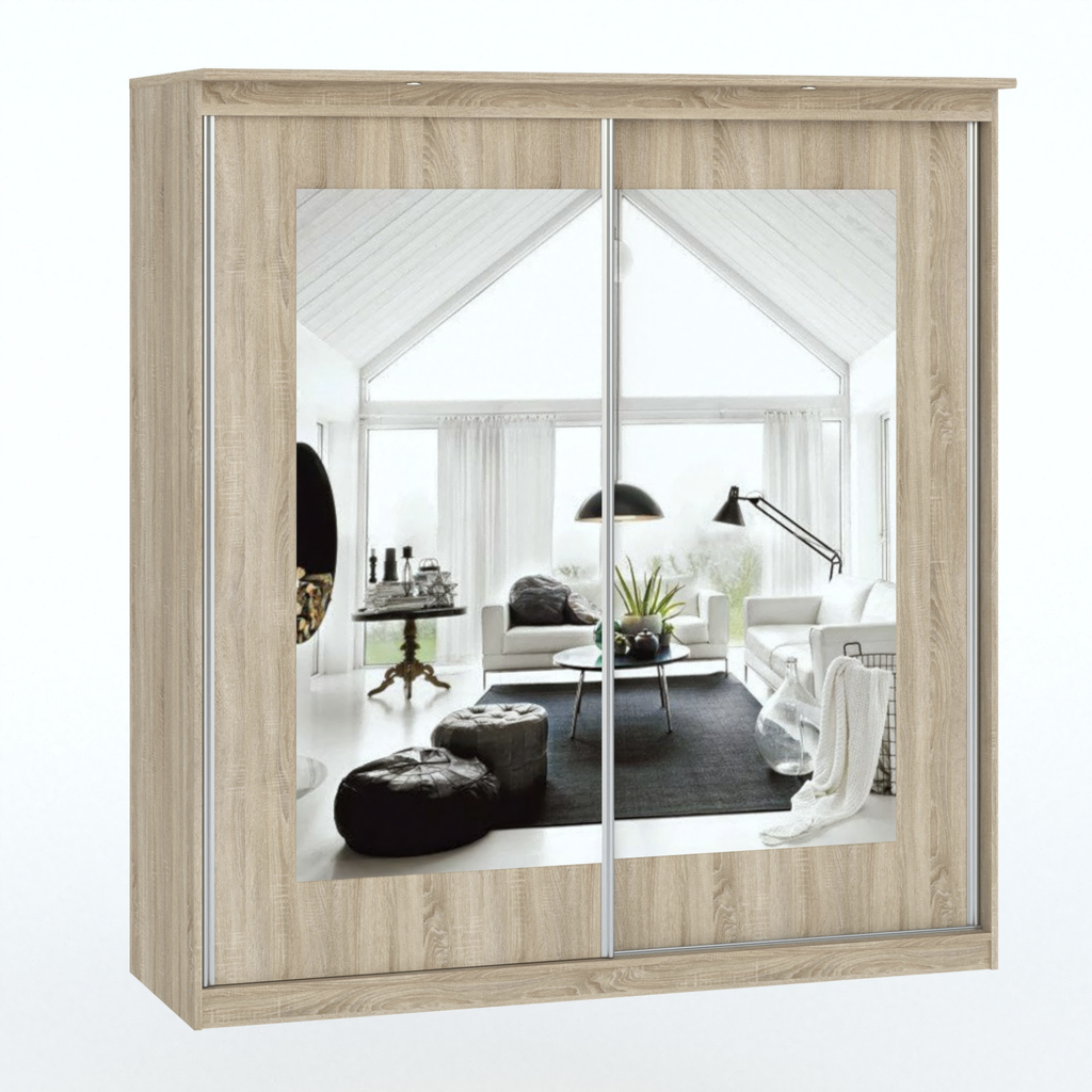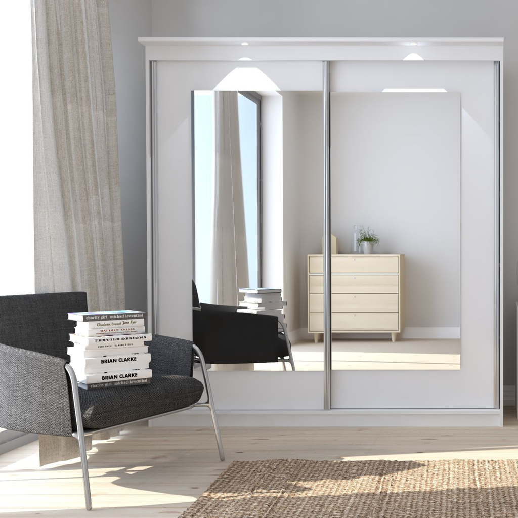 Erdvi ir talpi slankiojančių durų spinta yra stilingas ir funkcionalus sprendimas jūsų namams. Dvi veidrodinės durys vizualiai praplečia erdvę, o viršutiniai LED šviestuvai, prijungiami prie rozetės, suteikia papildomą šviesos šaltinį ir elegantišką akcentą.