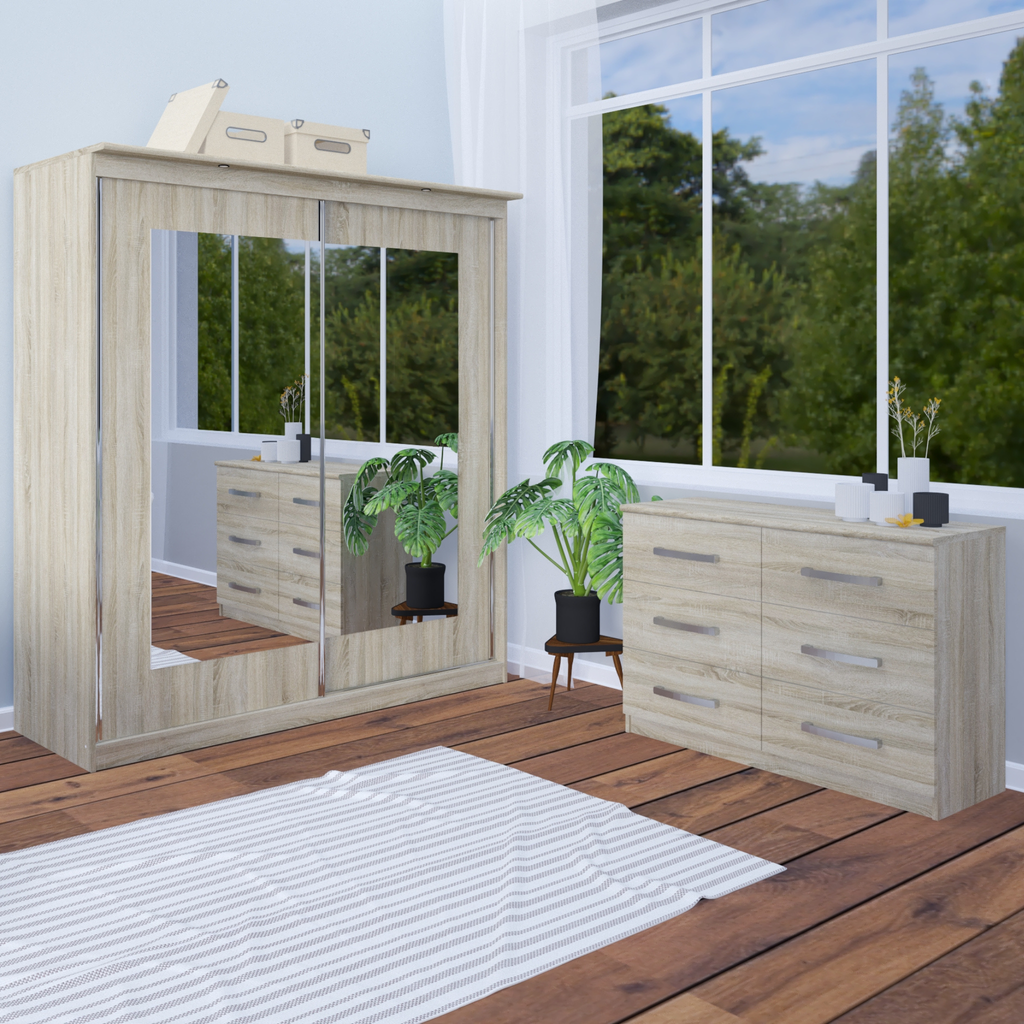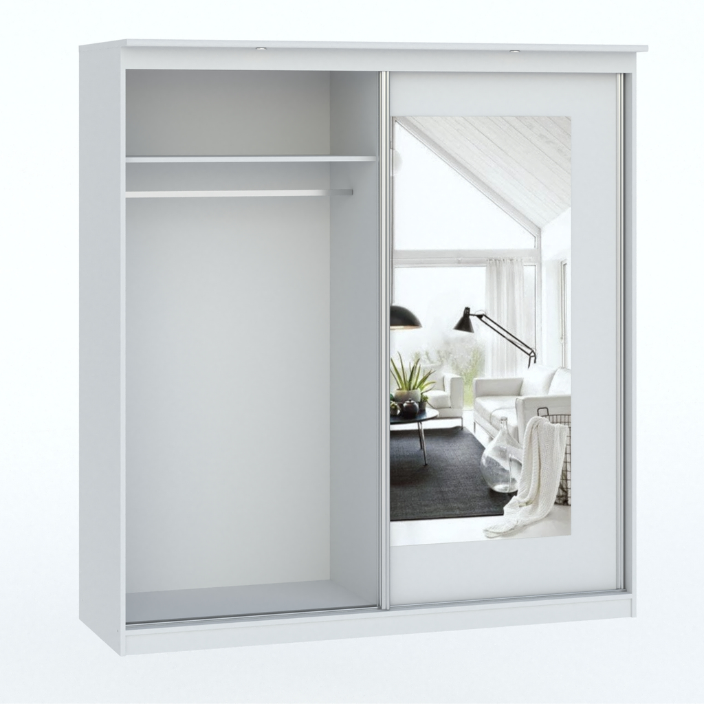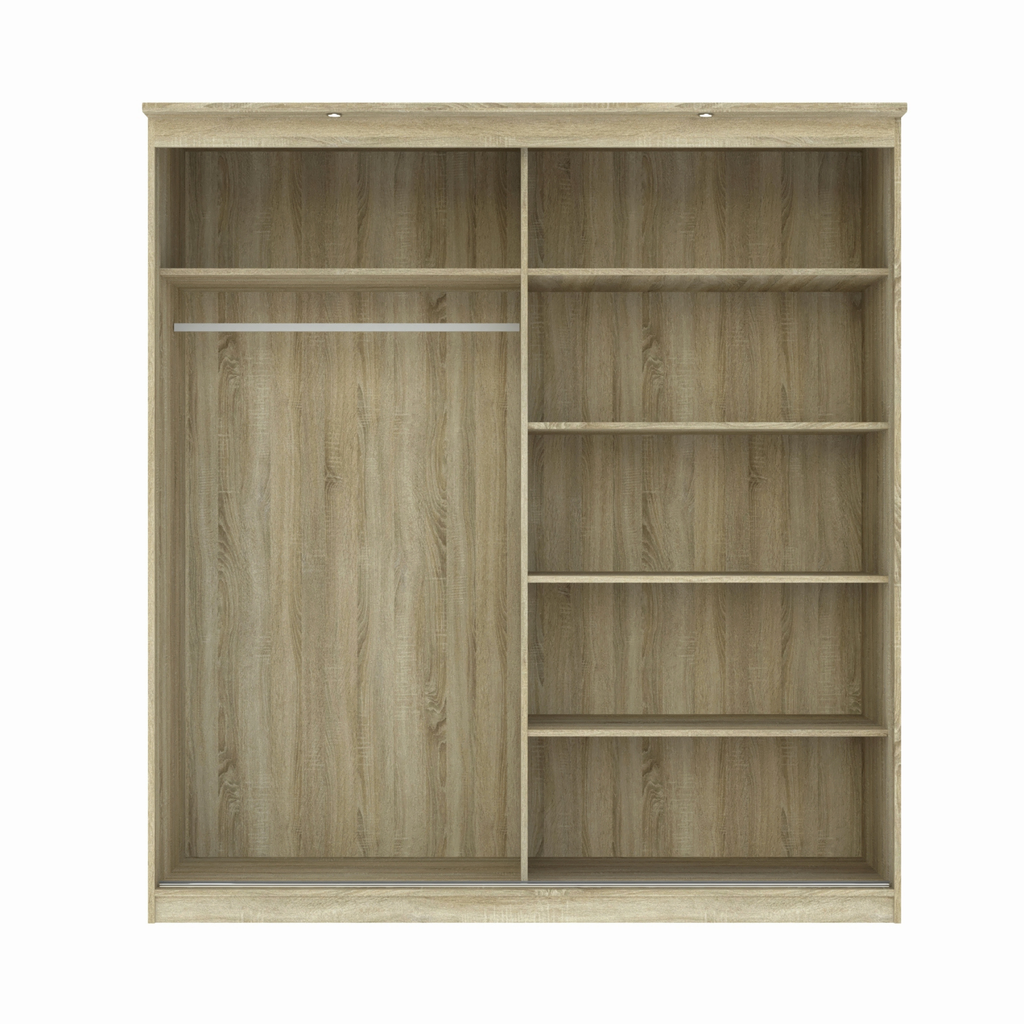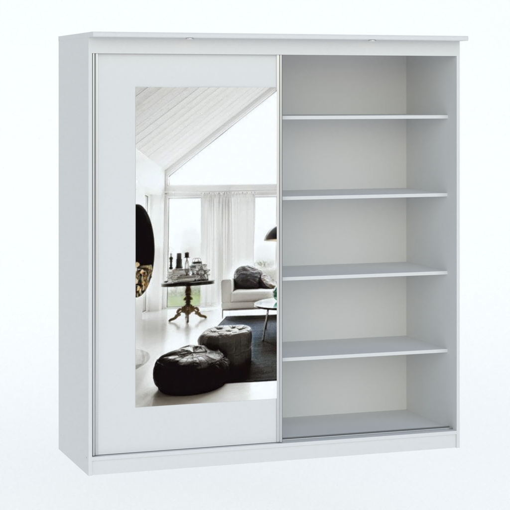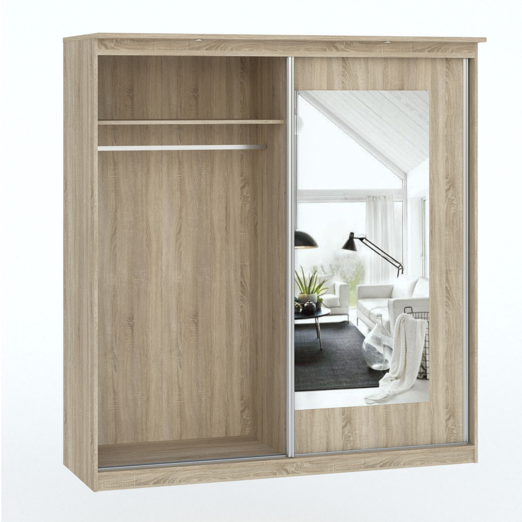 Erdvi ir talpi slankiojančių durų spinta yra stilingas ir funkcionalus sprendimas jūsų namams. Dvi veidrodinės durys vizualiai praplečia erdvę, o viršutiniai LED šviestuvai, prijungiami prie rozetės, suteikia papildomą šviesos šaltinį ir elegantišką akcentą.